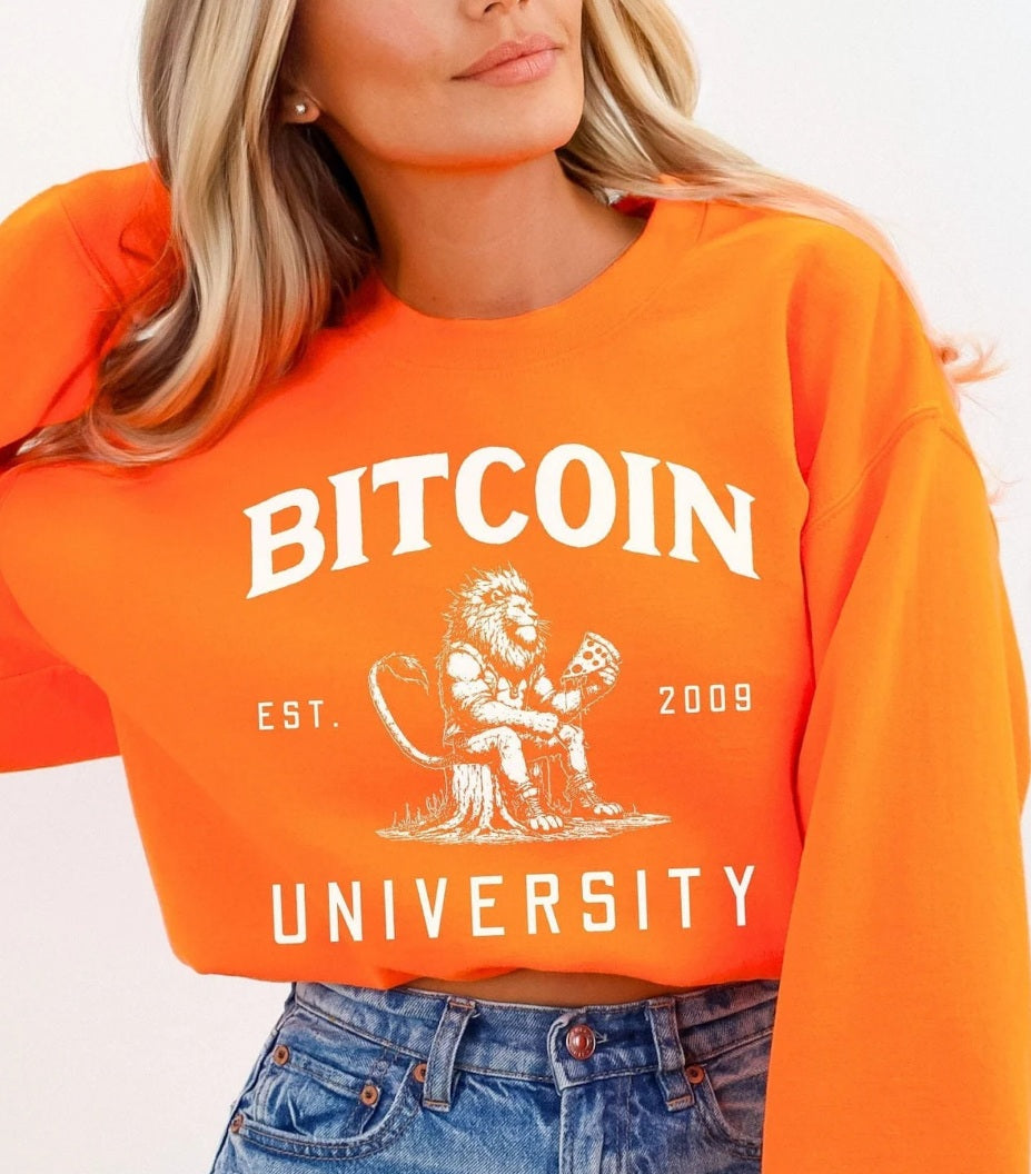Step into the future of finance with the Crypto Campus Crewneck—a must-have for Bitcoin trailblazers and blockchain believers! This Gildan Unisex Sweatshirt (Gildan 18000) isn’t just a cozy staple; it’s a statement. Rocking the iconic "Bitcoin University Est. 2009" design with a lion chomping on a pizza slice (a tribute to the legendary 10,000 BTC pizza transaction), this crewneck celebrates Bitcoin’s decentralized revolution in style. Crafted from a 50% cotton, 50% polyester blend, its medium-heavy 8.0 oz/yd² (271.25 g/m²) fabric delivers a soft, relaxed fit that’s perfect for HODLing through market dips or sparking crypto convos at the coffee shop.